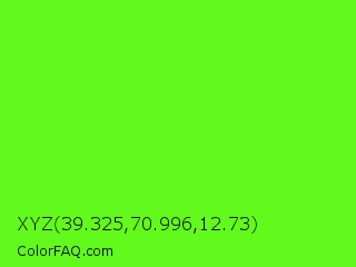 XYZ 39.325,70.996,12.73 Color is a normal green color and the nearest color is Bright Green #66ff00. Hex code #61fa1c and RGB value is rgb(97,250,28). In RGB color space, this color is composed of 38% red, 98% green, 11% blue, In CMYK color space, this color is composed of 61% cyan, 0% magenta, 89% yellow , 2% black , In HSL color space, this color has a hue angle of 101° , 96% saturation and 55% lightness.