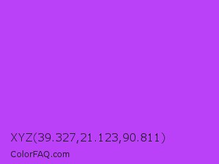XYZ 39.327,21.123,90.811 Color is a light purple color and the nearest color is Medium Orchid #ba55d3. Hex code #bb41f8 and RGB value is rgb(187,65,248). In RGB color space, this color is composed of 73% red, 25% green, 97% blue, In CMYK color space, this color is composed of 25% cyan, 74% magenta, 0% yellow , 3% black , In HSL color space, this color has a hue angle of 280° , 93% saturation and 61% lightness.