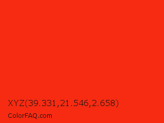XYZ 39.331,21.546,2.658 Color is a normal red color and the nearest color is Red RYB #fe2712. Hex code #f72b12 and RGB value is rgb(247,43,18). In RGB color space, this color is composed of 97% red, 17% green, 7% blue, In CMYK color space, this color is composed of 0% cyan, 83% magenta, 93% yellow , 3% black , In HSL color space, this color has a hue angle of 7° , 93% saturation and 52% lightness.