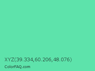 XYZ 39.334,60.206,48.076 Color is a light green color and the nearest color is Medium Aquamarine #66ddaa. Hex code #5de3ab and RGB value is rgb(93,227,171). In RGB color space, this color is composed of 36% red, 89% green, 67% blue, In CMYK color space, this color is composed of 59% cyan, 0% magenta, 25% yellow , 11% black , In HSL color space, this color has a hue angle of 155° , 71% saturation and 63% lightness.