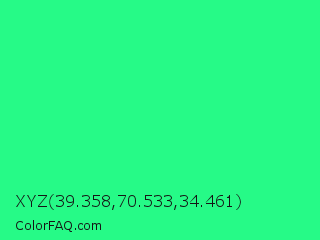 XYZ 39.358,70.533,34.461 Color is a normal green color and the nearest color is Spring Green #00ff7f. Hex code #26fa87 and RGB value is rgb(38,250,135). In RGB color space, this color is composed of 15% red, 98% green, 53% blue, In CMYK color space, this color is composed of 85% cyan, 0% magenta, 46% yellow , 2% black , In HSL color space, this color has a hue angle of 147° , 95% saturation and 56% lightness.
