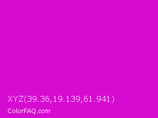XYZ 39.36,19.139,61.941 Color is a normal magenta color and the nearest color is Deep Magenta #cc00cc. Hex code #d60bd1 and RGB value is rgb(214,11,209). In RGB color space, this color is composed of 84% red, 4% green, 82% blue, In CMYK color space, this color is composed of 0% cyan, 95% magenta, 2% yellow , 16% black , In HSL color space, this color has a hue angle of 301° , 90% saturation and 44% lightness.