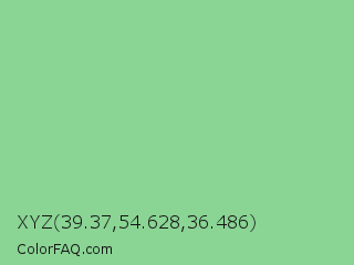 XYZ 39.37,54.628,36.486 Color is a light green color and the nearest color is Eton Blue #96c8a2. Hex code #8ad494 and RGB value is rgb(138,212,148). In RGB color space, this color is composed of 54% red, 83% green, 58% blue, In CMYK color space, this color is composed of 35% cyan, 0% magenta, 30% yellow , 17% black , In HSL color space, this color has a hue angle of 128° , 46% saturation and 69% lightness.