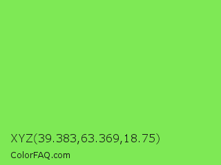 XYZ 39.383,63.369,18.75 Color is a light green color and the nearest color is Kiwi #8ee53f. Hex code #7ee955 and RGB value is rgb(126,233,85). In RGB color space, this color is composed of 49% red, 91% green, 33% blue, In CMYK color space, this color is composed of 46% cyan, 0% magenta, 64% yellow , 9% black , In HSL color space, this color has a hue angle of 103° , 77% saturation and 62% lightness.