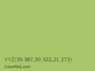 XYZ 39.387,50.322,21.273 Color is a normal lime color and the nearest color is Middle Green Yellow #acbf60. Hex code #a9c76a and RGB value is rgb(169,199,106). In RGB color space, this color is composed of 66% red, 78% green, 42% blue, In CMYK color space, this color is composed of 15% cyan, 0% magenta, 47% yellow , 22% black , In HSL color space, this color has a hue angle of 79° , 45% saturation and 60% lightness.