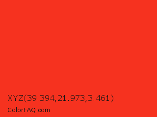 XYZ 39.394,21.973,3.461 Color is a normal red color and the nearest color is Red RYB #fe2712. Hex code #f6321f and RGB value is rgb(246,50,31). In RGB color space, this color is composed of 96% red, 20% green, 12% blue, In CMYK color space, this color is composed of 0% cyan, 80% magenta, 87% yellow , 4% black , In HSL color space, this color has a hue angle of 5° , 92% saturation and 54% lightness.