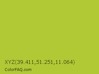 XYZ 39.411,51.251,11.064 Color is a normal yellow color and the nearest color is Android Green #a4c639. Hex code #b0c934 and RGB value is rgb(176,201,52). In RGB color space, this color is composed of 69% red, 79% green, 20% blue, In CMYK color space, this color is composed of 12% cyan, 0% magenta, 74% yellow , 21% black , In HSL color space, this color has a hue angle of 70° , 59% saturation and 50% lightness.
