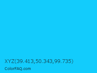 XYZ 39.413,50.343,99.735 Color is a normal cyan color and the nearest color is Spiro Disco Ball #0fc0fc. Hex code #12ccfc and RGB value is rgb(18,204,252). In RGB color space, this color is composed of 7% red, 80% green, 99% blue, In CMYK color space, this color is composed of 93% cyan, 19% magenta, 0% yellow , 1% black , In HSL color space, this color has a hue angle of 192° , 98% saturation and 53% lightness.
