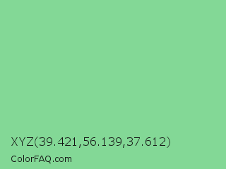 XYZ 39.421,56.139,37.612 Color is a light green color and the nearest color is De York #7ac488. Hex code #83d896 and RGB value is rgb(131,216,150). In RGB color space, this color is composed of 51% red, 85% green, 59% blue, In CMYK color space, this color is composed of 39% cyan, 0% magenta, 31% yellow , 15% black , In HSL color space, this color has a hue angle of 133° , 52% saturation and 68% lightness.