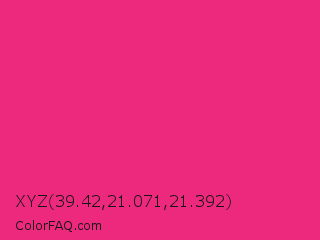 XYZ 39.42,21.071,21.392 Color is a normal rose color and the nearest color is Cerise Pink #ec3b83. Hex code #ed297d and RGB value is rgb(237,41,125). In RGB color space, this color is composed of 93% red, 16% green, 49% blue, In CMYK color space, this color is composed of 0% cyan, 83% magenta, 47% yellow , 7% black , In HSL color space, this color has a hue angle of 334° , 84% saturation and 55% lightness.