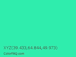 XYZ 39.433,64.844,49.973 Color is a normal green color and the nearest color is Eucalyptus #44d7a8. Hex code #32eead and RGB value is rgb(50,238,173). In RGB color space, this color is composed of 20% red, 93% green, 68% blue, In CMYK color space, this color is composed of 79% cyan, 0% magenta, 27% yellow , 7% black , In HSL color space, this color has a hue angle of 159° , 85% saturation and 56% lightness.