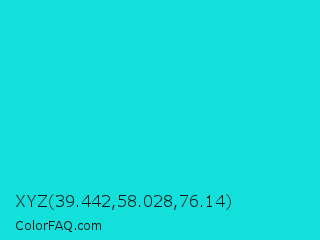 XYZ 39.442,58.028,76.14 Color is a normal cyan color and the nearest color is Bright Turquoise #08e8de. Hex code #13dfdb and RGB value is rgb(19,223,219). In RGB color space, this color is composed of 7% red, 87% green, 86% blue, In CMYK color space, this color is composed of 91% cyan, 0% magenta, 2% yellow , 13% black , In HSL color space, this color has a hue angle of 179° , 84% saturation and 47% lightness.