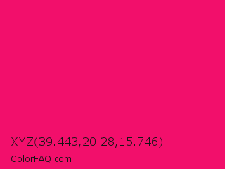 XYZ 39.443,20.28,15.746 Color is a normal rose color and the nearest color is Vivid Raspberry #ff006c. Hex code #f20f6b and RGB value is rgb(242,15,107). In RGB color space, this color is composed of 95% red, 6% green, 42% blue, In CMYK color space, this color is composed of 0% cyan, 94% magenta, 56% yellow , 5% black , In HSL color space, this color has a hue angle of 336° , 90% saturation and 50% lightness.