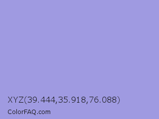 XYZ 39.444,35.918,76.088 Color is a light indigo color and the nearest color is Dull Lavender #a899e6. Hex code #9f9ae1 and RGB value is rgb(159,154,225). In RGB color space, this color is composed of 62% red, 60% green, 88% blue, In CMYK color space, this color is composed of 29% cyan, 32% magenta, 0% yellow , 12% black , In HSL color space, this color has a hue angle of 244° , 54% saturation and 74% lightness.