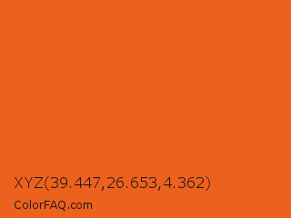 XYZ 39.447,26.653,4.362 Color is a normal orange color and the nearest color is Vivid Vermilion #e56024. Hex code #ed611f and RGB value is rgb(237,97,31). In RGB color space, this color is composed of 93% red, 38% green, 12% blue, In CMYK color space, this color is composed of 0% cyan, 59% magenta, 87% yellow , 7% black , In HSL color space, this color has a hue angle of 19° , 85% saturation and 53% lightness.