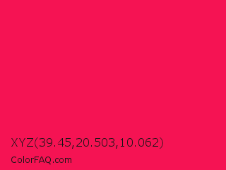 XYZ 39.45,20.503,10.062 Color is a normal rose color and the nearest color is Red Crayola #ee204d. Hex code #f51353 and RGB value is rgb(245,19,83). In RGB color space, this color is composed of 96% red, 7% green, 33% blue, In CMYK color space, this color is composed of 0% cyan, 92% magenta, 66% yellow , 4% black , In HSL color space, this color has a hue angle of 343° , 92% saturation and 52% lightness.