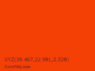 XYZ 39.467,22.981,2.528 Color is a normal red color and the nearest color is Orange Red #ff4500. Hex code #f53f06 and RGB value is rgb(245,63,6). In RGB color space, this color is composed of 96% red, 25% green, 2% blue, In CMYK color space, this color is composed of 0% cyan, 74% magenta, 98% yellow , 4% black , In HSL color space, this color has a hue angle of 14° , 95% saturation and 49% lightness.