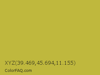 XYZ 39.469,45.694,11.155 Color is a normal yellow color and the nearest color is Earls Green #c9b93b. Hex code #bfb83d and RGB value is rgb(191,184,61). In RGB color space, this color is composed of 75% red, 72% green, 24% blue, In CMYK color space, this color is composed of 0% cyan, 4% magenta, 68% yellow , 25% black , In HSL color space, this color has a hue angle of 57° , 52% saturation and 49% lightness.