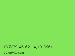 XYZ 39.46,62.14,19.366 Color is a light green color and the nearest color is Kiwi #8ee53f. Hex code #83e659 and RGB value is rgb(131,230,89). In RGB color space, this color is composed of 51% red, 90% green, 35% blue, In CMYK color space, this color is composed of 43% cyan, 0% magenta, 61% yellow , 10% black , In HSL color space, this color has a hue angle of 102° , 74% saturation and 63% lightness.