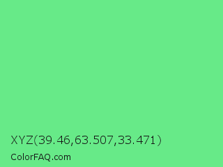 XYZ 39.46,63.507,33.471 Color is a light green color and the nearest color is Very Light Malachite Green #64e986. Hex code #67ea88 and RGB value is rgb(103,234,136). In RGB color space, this color is composed of 40% red, 92% green, 53% blue, In CMYK color space, this color is composed of 56% cyan, 0% magenta, 42% yellow , 8% black , In HSL color space, this color has a hue angle of 135° , 76% saturation and 66% lightness.