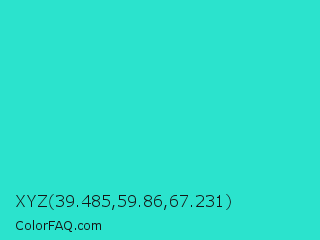 XYZ 39.485,59.86,67.231 Color is a normal cyan color and the nearest color is Turquoise PWG #30d5c8. Hex code #2be3cd and RGB value is rgb(43,227,205). In RGB color space, this color is composed of 17% red, 89% green, 80% blue, In CMYK color space, this color is composed of 81% cyan, 0% magenta, 10% yellow , 11% black , In HSL color space, this color has a hue angle of 173° , 77% saturation and 53% lightness.