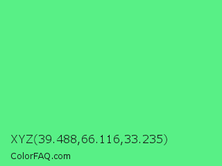 XYZ 39.488,66.116,33.235 Color is a light green color and the nearest color is Very Light Malachite Green #64e986. Hex code #58f086 and RGB value is rgb(88,240,134). In RGB color space, this color is composed of 35% red, 94% green, 53% blue, In CMYK color space, this color is composed of 63% cyan, 0% magenta, 44% yellow , 6% black , In HSL color space, this color has a hue angle of 138° , 84% saturation and 64% lightness.