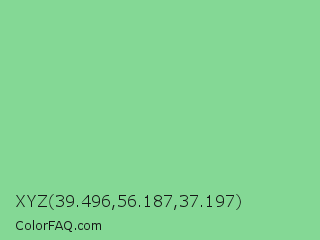 XYZ 39.496,56.187,37.197 Color is a light green color and the nearest color is Light Green #90ee90. Hex code #84d895 and RGB value is rgb(132,216,149). In RGB color space, this color is composed of 52% red, 85% green, 58% blue, In CMYK color space, this color is composed of 39% cyan, 0% magenta, 31% yellow , 15% black , In HSL color space, this color has a hue angle of 132° , 52% saturation and 68% lightness.