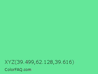 XYZ 39.499,62.128,39.616 Color is a light green color and the nearest color is Very Light Malachite Green #64e986. Hex code #64e798 and RGB value is rgb(100,231,152). In RGB color space, this color is composed of 39% red, 91% green, 60% blue, In CMYK color space, this color is composed of 57% cyan, 0% magenta, 34% yellow , 9% black , In HSL color space, this color has a hue angle of 144° , 73% saturation and 65% lightness.