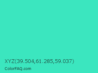 XYZ 39.504,61.285,59.037 Color is a normal cyan color and the nearest color is Turquoise #40e0d0. Hex code #3be6bf and RGB value is rgb(59,230,191). In RGB color space, this color is composed of 23% red, 90% green, 75% blue, In CMYK color space, this color is composed of 74% cyan, 0% magenta, 17% yellow , 10% black , In HSL color space, this color has a hue angle of 166° , 77% saturation and 57% lightness.
