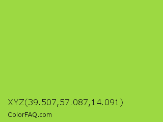 XYZ 39.507,57.087,14.091 Color is a normal green color and the nearest color is Kiwi #8ee53f. Hex code #9cd942 and RGB value is rgb(156,217,66). In RGB color space, this color is composed of 61% red, 85% green, 26% blue, In CMYK color space, this color is composed of 28% cyan, 0% magenta, 70% yellow , 15% black , In HSL color space, this color has a hue angle of 84° , 67% saturation and 55% lightness.