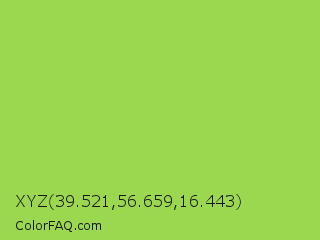 XYZ 39.521,56.659,16.443 Color is a normal green color and the nearest color is Conifer #acdd4d. Hex code #9bd850 and RGB value is rgb(155,216,80). In RGB color space, this color is composed of 61% red, 85% green, 31% blue, In CMYK color space, this color is composed of 28% cyan, 0% magenta, 63% yellow , 15% black , In HSL color space, this color has a hue angle of 87° , 64% saturation and 58% lightness.