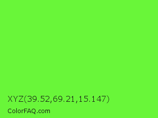 XYZ 39.52,69.21,15.147 Color is a normal green color and the nearest color is Spring Frost #87ff2a. Hex code #69f639 and RGB value is rgb(105,246,57). In RGB color space, this color is composed of 41% red, 96% green, 22% blue, In CMYK color space, this color is composed of 57% cyan, 0% magenta, 77% yellow , 4% black , In HSL color space, this color has a hue angle of 105° , 91% saturation and 59% lightness.