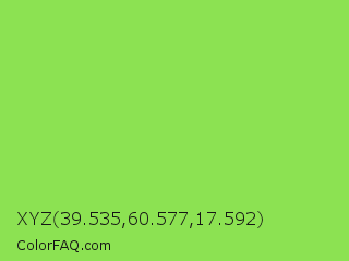 XYZ 39.535,60.577,17.592 Color is a normal green color and the nearest color is Kiwi #8ee53f. Hex code #8ce252 and RGB value is rgb(140,226,82). In RGB color space, this color is composed of 55% red, 89% green, 32% blue, In CMYK color space, this color is composed of 38% cyan, 0% magenta, 64% yellow , 11% black , In HSL color space, this color has a hue angle of 96° , 71% saturation and 60% lightness.