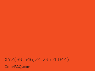 XYZ 39.546,24.295,4.044 Color is a normal red color and the nearest color is Pomegranate #f34723. Hex code #f24d21 and RGB value is rgb(242,77,33). In RGB color space, this color is composed of 95% red, 30% green, 13% blue, In CMYK color space, this color is composed of 0% cyan, 68% magenta, 86% yellow , 5% black , In HSL color space, this color has a hue angle of 13° , 89% saturation and 54% lightness.