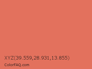 XYZ 39.559,28.931,13.855 Color is a light red color and the nearest color is Terracotta #e2725b. Hex code #e3715d and RGB value is rgb(227,113,93). In RGB color space, this color is composed of 89% red, 44% green, 36% blue, In CMYK color space, this color is composed of 0% cyan, 50% magenta, 59% yellow , 11% black , In HSL color space, this color has a hue angle of 9° , 71% saturation and 63% lightness.