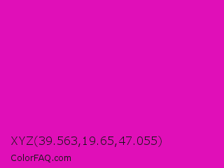 XYZ 39.563,19.65,47.055 Color is a normal magenta color and the nearest color is Shocking Pink #fc0fc0. Hex code #e00fb8 and RGB value is rgb(224,15,184). In RGB color space, this color is composed of 88% red, 6% green, 72% blue, In CMYK color space, this color is composed of 0% cyan, 93% magenta, 18% yellow , 12% black , In HSL color space, this color has a hue angle of 311° , 87% saturation and 47% lightness.