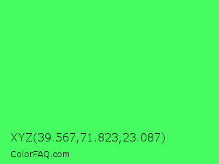 XYZ 39.567,71.823,23.087 Color is a light green color and the nearest color is Screamin Green #66ff66. Hex code #47fc61 and RGB value is rgb(71,252,97). In RGB color space, this color is composed of 28% red, 99% green, 38% blue, In CMYK color space, this color is composed of 72% cyan, 0% magenta, 62% yellow , 1% black , In HSL color space, this color has a hue angle of 129° , 97% saturation and 63% lightness.