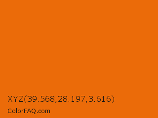 XYZ 39.568,28.197,3.616 Color is a normal orange color and the nearest color is Christine #e7730a. Hex code #eb6b09 and RGB value is rgb(235,107,9). In RGB color space, this color is composed of 92% red, 42% green, 4% blue, In CMYK color space, this color is composed of 0% cyan, 54% magenta, 96% yellow , 8% black , In HSL color space, this color has a hue angle of 26° , 93% saturation and 48% lightness.