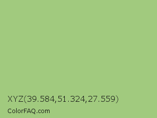 XYZ 39.584,51.324,27.559 Color is a light green color and the nearest color is Pistachio #93c572. Hex code #a1ca7e and RGB value is rgb(161,202,126). In RGB color space, this color is composed of 63% red, 79% green, 49% blue, In CMYK color space, this color is composed of 20% cyan, 0% magenta, 38% yellow , 21% black , In HSL color space, this color has a hue angle of 92° , 42% saturation and 64% lightness.