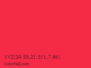 XYZ 39.59,21.511,7.86 Color is a normal red color and the nearest color is Red Crayola #ee204d. Hex code #f52a46 and RGB value is rgb(245,42,70). In RGB color space, this color is composed of 96% red, 16% green, 27% blue, In CMYK color space, this color is composed of 0% cyan, 83% magenta, 71% yellow , 4% black , In HSL color space, this color has a hue angle of 352° , 91% saturation and 56% lightness.