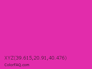 XYZ 39.615,20.91,40.476 Color is a normal magenta color and the nearest color is Frostbite #e936a7. Hex code #e22cab and RGB value is rgb(226,44,171). In RGB color space, this color is composed of 89% red, 17% green, 67% blue, In CMYK color space, this color is composed of 0% cyan, 81% magenta, 24% yellow , 11% black , In HSL color space, this color has a hue angle of 318° , 76% saturation and 53% lightness.