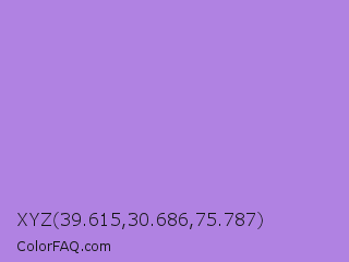 XYZ 39.615,30.686,75.787 Color is a light violet color and the nearest color is Lavender #b57edc. Hex code #b082e2 and RGB value is rgb(176,130,226). In RGB color space, this color is composed of 69% red, 51% green, 89% blue, In CMYK color space, this color is composed of 22% cyan, 42% magenta, 0% yellow , 11% black , In HSL color space, this color has a hue angle of 269° , 62% saturation and 70% lightness.