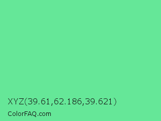 XYZ 39.61,62.186,39.621 Color is a light green color and the nearest color is Very Light Malachite Green #64e986. Hex code #65e798 and RGB value is rgb(101,231,152). In RGB color space, this color is composed of 40% red, 91% green, 60% blue, In CMYK color space, this color is composed of 56% cyan, 0% magenta, 34% yellow , 9% black , In HSL color space, this color has a hue angle of 144° , 73% saturation and 65% lightness.