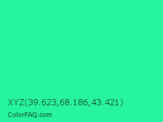 XYZ 39.623,68.186,43.421 Color is a normal green color and the nearest color is Medium Spring Green #00fa9a. Hex code #26f59e and RGB value is rgb(38,245,158). In RGB color space, this color is composed of 15% red, 96% green, 62% blue, In CMYK color space, this color is composed of 84% cyan, 0% magenta, 36% yellow , 4% black , In HSL color space, this color has a hue angle of 155° , 91% saturation and 55% lightness.