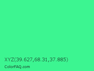 XYZ 39.627,68.31,37.885 Color is a normal green color and the nearest color is Eucalyptus #44d7a8. Hex code #3cf591 and RGB value is rgb(60,245,145). In RGB color space, this color is composed of 24% red, 96% green, 57% blue, In CMYK color space, this color is composed of 76% cyan, 0% magenta, 41% yellow , 4% black , In HSL color space, this color has a hue angle of 148° , 90% saturation and 60% lightness.