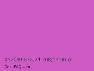 XYZ 39.632,24.708,54.905 Color is a normal magenta color and the nearest color is Fuchsia Pink #c154c1. Hex code #d05ac4 and RGB value is rgb(208,90,196). In RGB color space, this color is composed of 82% red, 35% green, 77% blue, In CMYK color space, this color is composed of 0% cyan, 57% magenta, 6% yellow , 18% black , In HSL color space, this color has a hue angle of 306° , 56% saturation and 58% lightness.