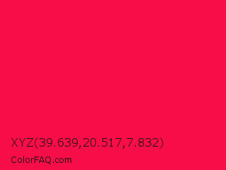 XYZ 39.639,20.517,7.832 Color is a normal red color and the nearest color is Red Ribbon #ed0a3f. Hex code #f70d47 and RGB value is rgb(247,13,71). In RGB color space, this color is composed of 97% red, 5% green, 28% blue, In CMYK color space, this color is composed of 0% cyan, 95% magenta, 71% yellow , 3% black , In HSL color space, this color has a hue angle of 345° , 94% saturation and 51% lightness.