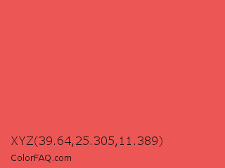 XYZ 39.64,25.305,11.389 Color is a light red color and the nearest color is Carnation #f95a61. Hex code #ec5755 and RGB value is rgb(236,87,85). In RGB color space, this color is composed of 93% red, 34% green, 33% blue, In CMYK color space, this color is composed of 0% cyan, 63% magenta, 64% yellow , 7% black , In HSL color space, this color has a hue angle of 1° , 80% saturation and 63% lightness.