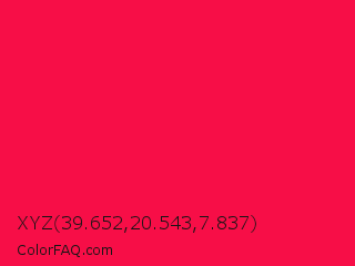 XYZ 39.652,20.543,7.837 Color is a normal red color and the nearest color is Red Ribbon #ed0a3f. Hex code #f70e47 and RGB value is rgb(247,14,71). In RGB color space, this color is composed of 97% red, 5% green, 28% blue, In CMYK color space, this color is composed of 0% cyan, 94% magenta, 71% yellow , 3% black , In HSL color space, this color has a hue angle of 345° , 94% saturation and 51% lightness.
