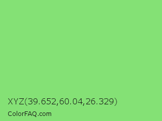 XYZ 39.652,60.04,26.329 Color is a light green color and the nearest color is Pastel Green #77dd77. Hex code #84e175 and RGB value is rgb(132,225,117). In RGB color space, this color is composed of 52% red, 88% green, 46% blue, In CMYK color space, this color is composed of 41% cyan, 0% magenta, 48% yellow , 12% black , In HSL color space, this color has a hue angle of 112° , 64% saturation and 67% lightness.